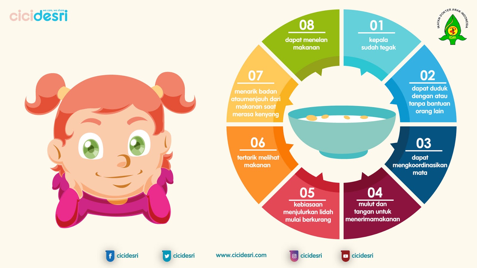 Ikatan Dokter Anak Indonesia (IDAI) menyatakan bahwa anak usia 6 bulan umumnya telah siap untuk diberikan MPASI. Adapun ciri bayi siap diberi MPASI yaitu :