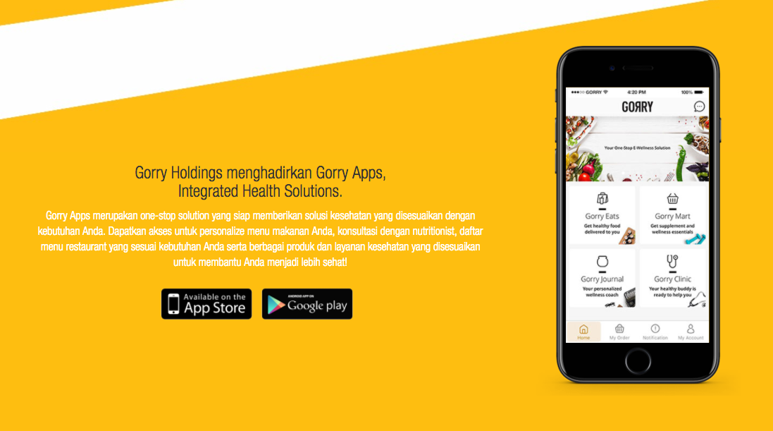 Sebagai bentuk peduli Gorry Gourmet terhadap kesehatan masyarakat, Gorry Holdings meluncurkan Gorry Apps, Integrated Helath Solutions yang dapat Anda unduh melalui smartphone. Dengan Gorry Mobile Apps, Anda dapat mengakses informasi menu makanan sehat, konsulrasi dengan nutritionist, daftar menu restaurant sesuai kebutuhan Anda serta produk dn layanan kesehatan.
